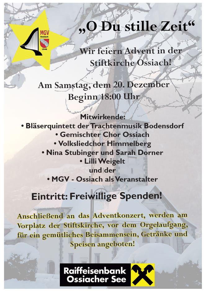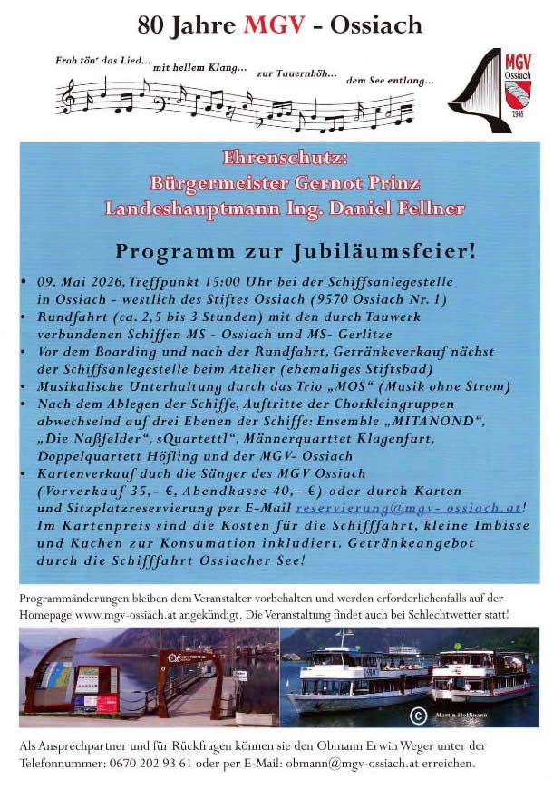 Der Männergesangsverein (MGV) Ossiach führt die Bezeichnung des seit Jahrhunderten bestehenden Ortes, an dem wir an den Ufern des Ossiacher Sees leben dürfen, im Vereinsnamen. Die Vereinsgründung erfolgte 1946 und ist in der Historie ausführlich beschrieben und dargestellt.